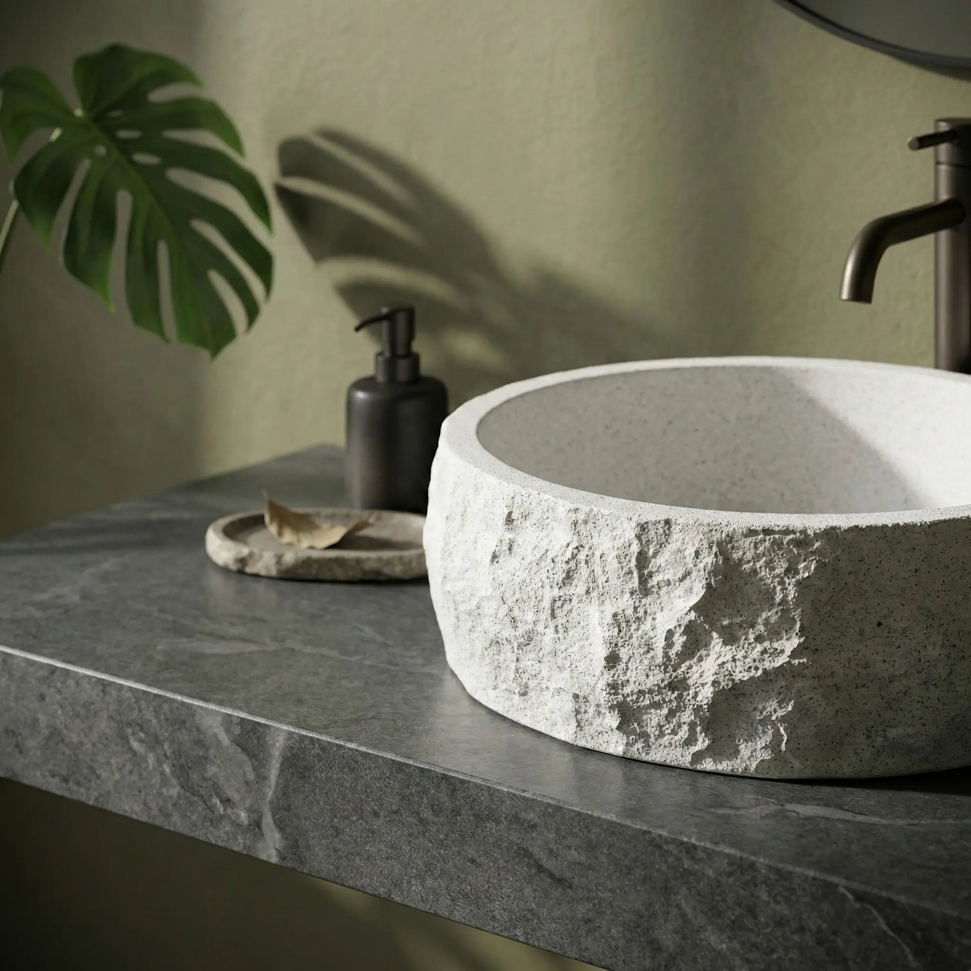 Dieses runde Aufsatzwaschbecken überzeugt durch seinen natürlichen, ausdrucksstarken Steinlook. Die matte, helle Oberfläche mit feiner Sprenkelung und die raue, unregelmäßige Außenseite verleihen dem Becken einen handwerklichen, organischen Charakter. Die Aufsatzmontage auf Platte oder Schrank setzt die besondere Struktur von allen Seiten optimal in Szene.