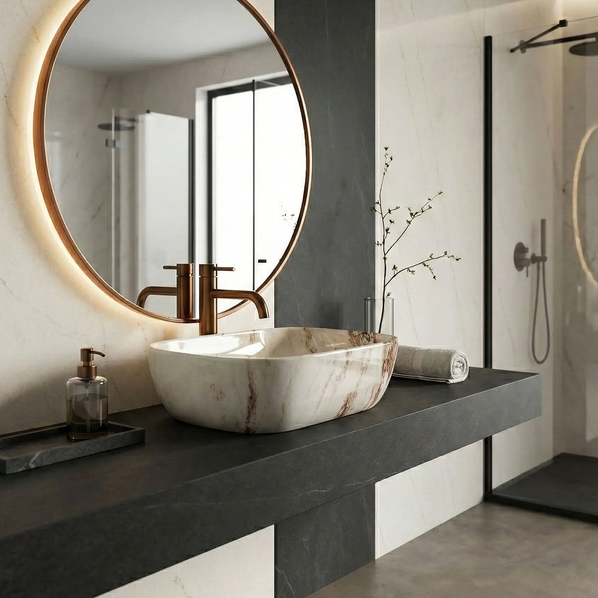 Dieses rechteckige Aufsatzwaschbecken besticht durch seine elegante, von Naturstein inspirierte Oberfläche. Das Marrone-Shiny-Muster verleiht dem Waschplatz eine luxuriöse und gleichzeitig natürliche Ausstrahlung, während die glänzende Oberfläche modernen Minimalismus mit pflegeleichter Handhabung verbindet.