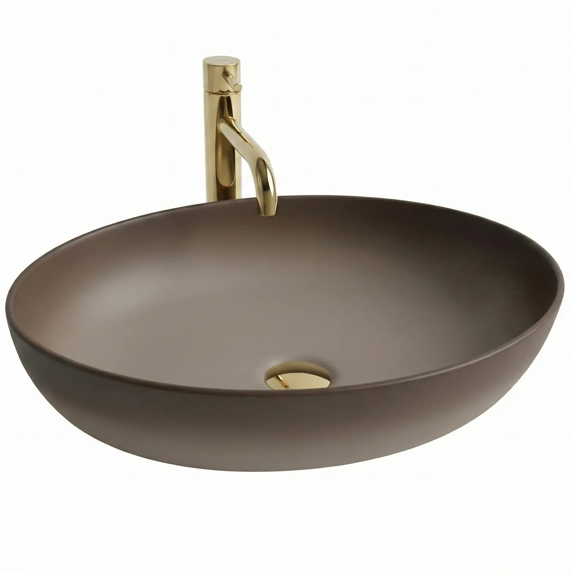 Dieses ovale Aufsatzwaschbecken besticht durch seine harmonische Verbindung aus minimalistischer Form und einer eleganten Ombre-Oberfläche mit einem sanften Farbverlauf von hellen zu dunkleren Brauntönen. Die matte Struktur verleiht dem Waschplatz Tiefe und einen modernen, natürlichen Charakter.