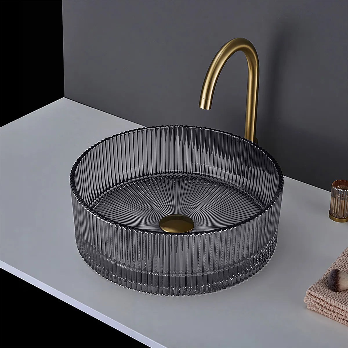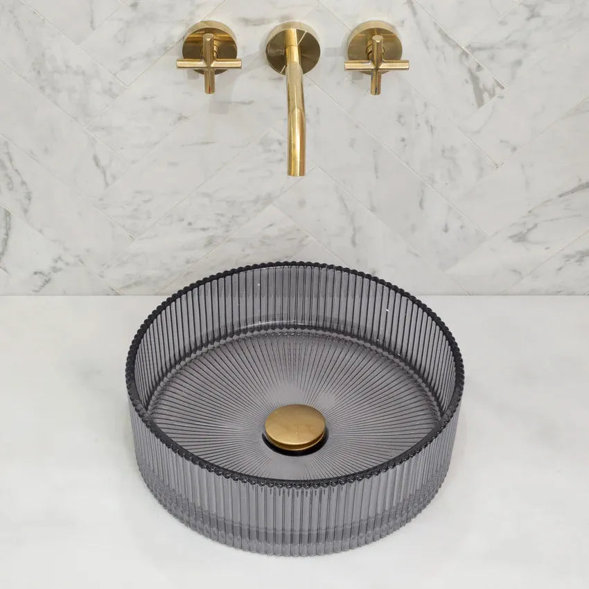 Design-Waschbecken „Ingrid Grey“ – Rundes Aufsatzwaschbecken aus Glas in geriffelter Struktur