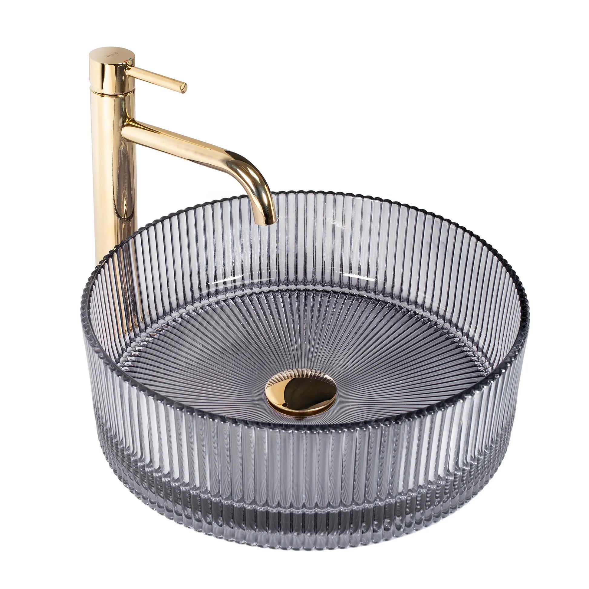 Verleihen Sie Ihrem Badezimmer modernen Luxus mit dem exklusiven Design-Waschbecken „Ingrid Grey“. Dieses stilvolle Aufsatzwaschbecken aus geriffeltem Glas überzeugt durch seine elegante, runde Form und die hochwertige Verarbeitung. Die dezente Grautönung in Kombination mit der gerippten Glasstruktur erzeugt faszinierende Lichtreflexe und macht jedes Waschbecken zu einem echten Blickfang.