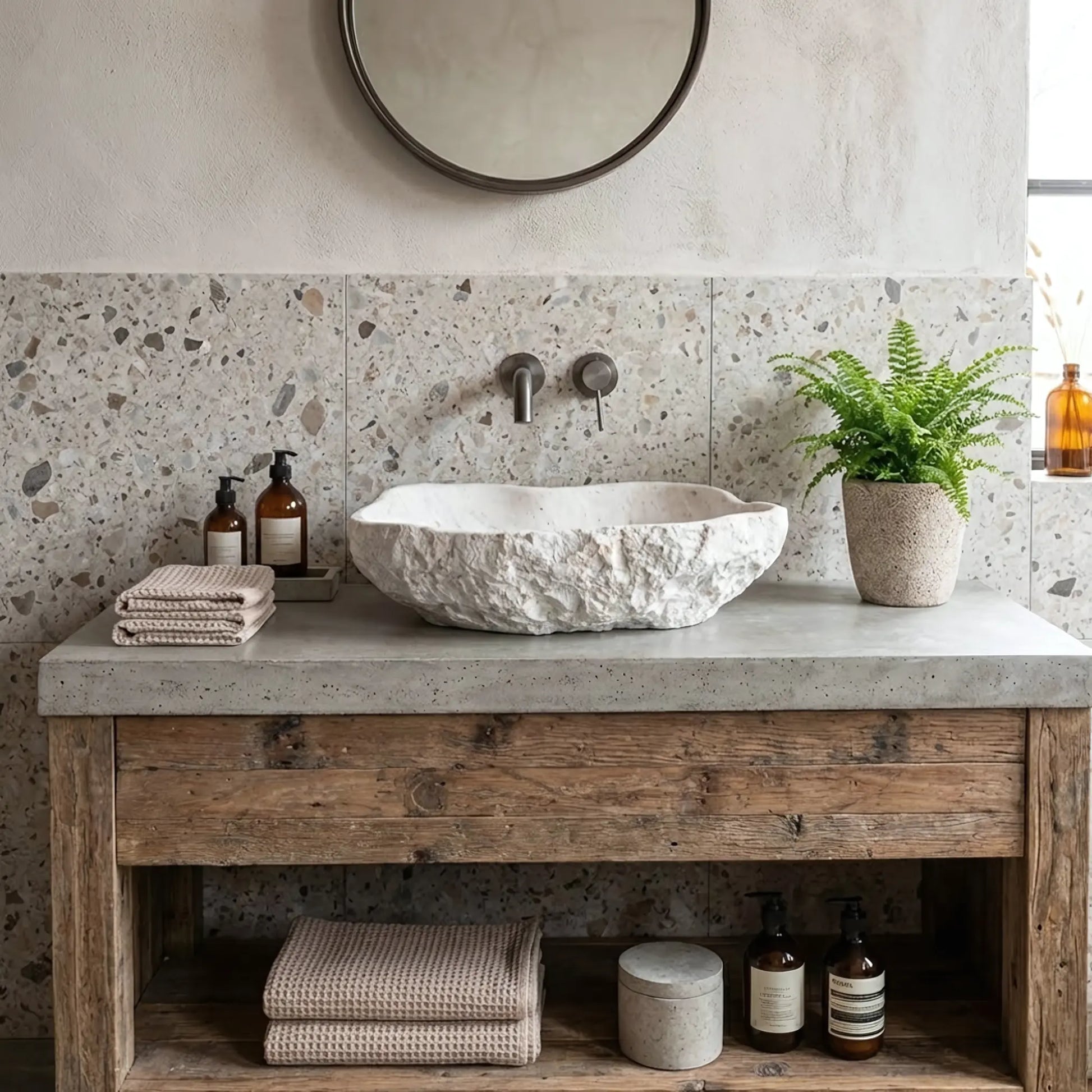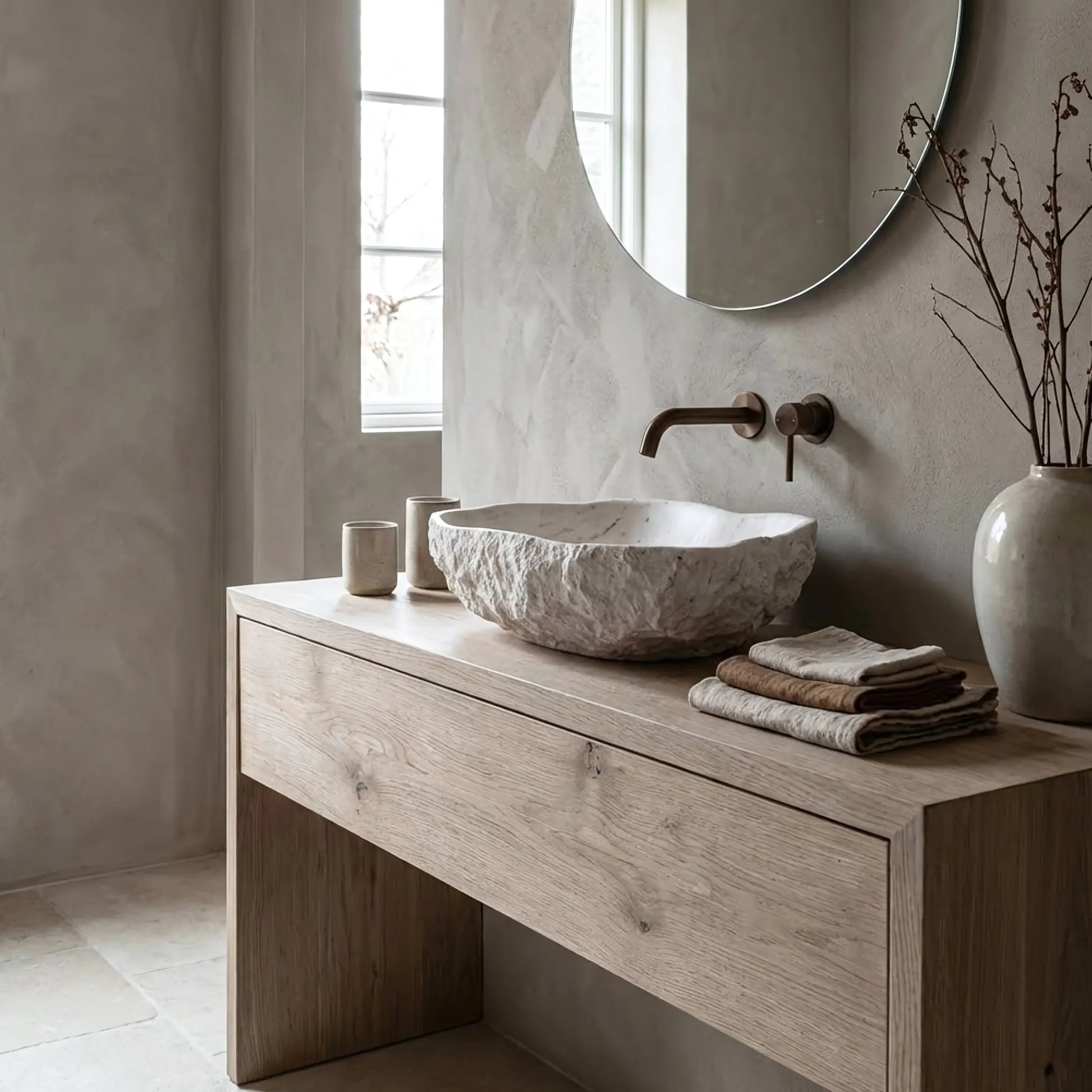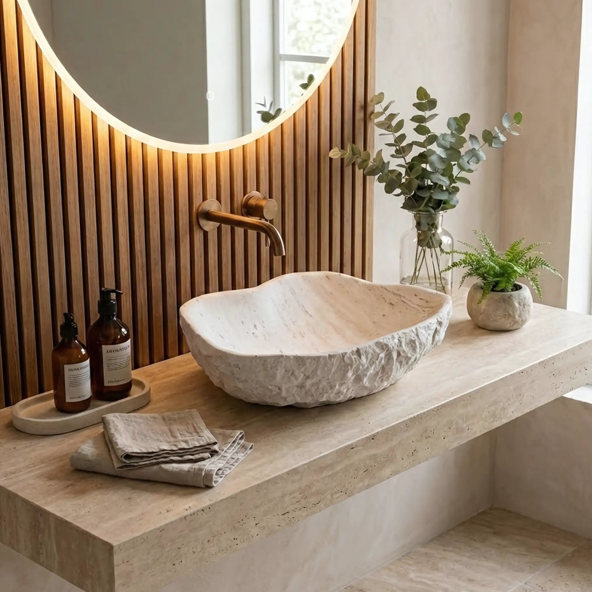 Dieses asymmetrische Aufsatzwaschbecken besticht durch seine unregelmäßige, organische Form und die raue, strukturierte Oberfläche, die an behauenen Fels erinnert. Die matte, helle Steinoptik verleiht dem Waschplatz eine natürliche und handwerkliche Ausstrahlung.