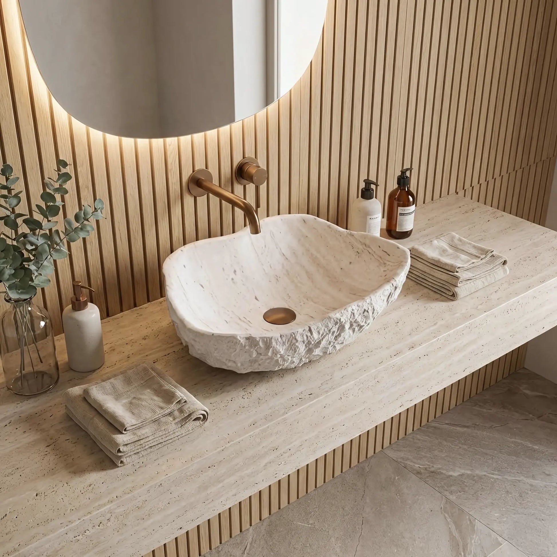 Aufsatzwaschbecken asymmetrisch – matte helle Steinoptik mit natürlicher Struktur