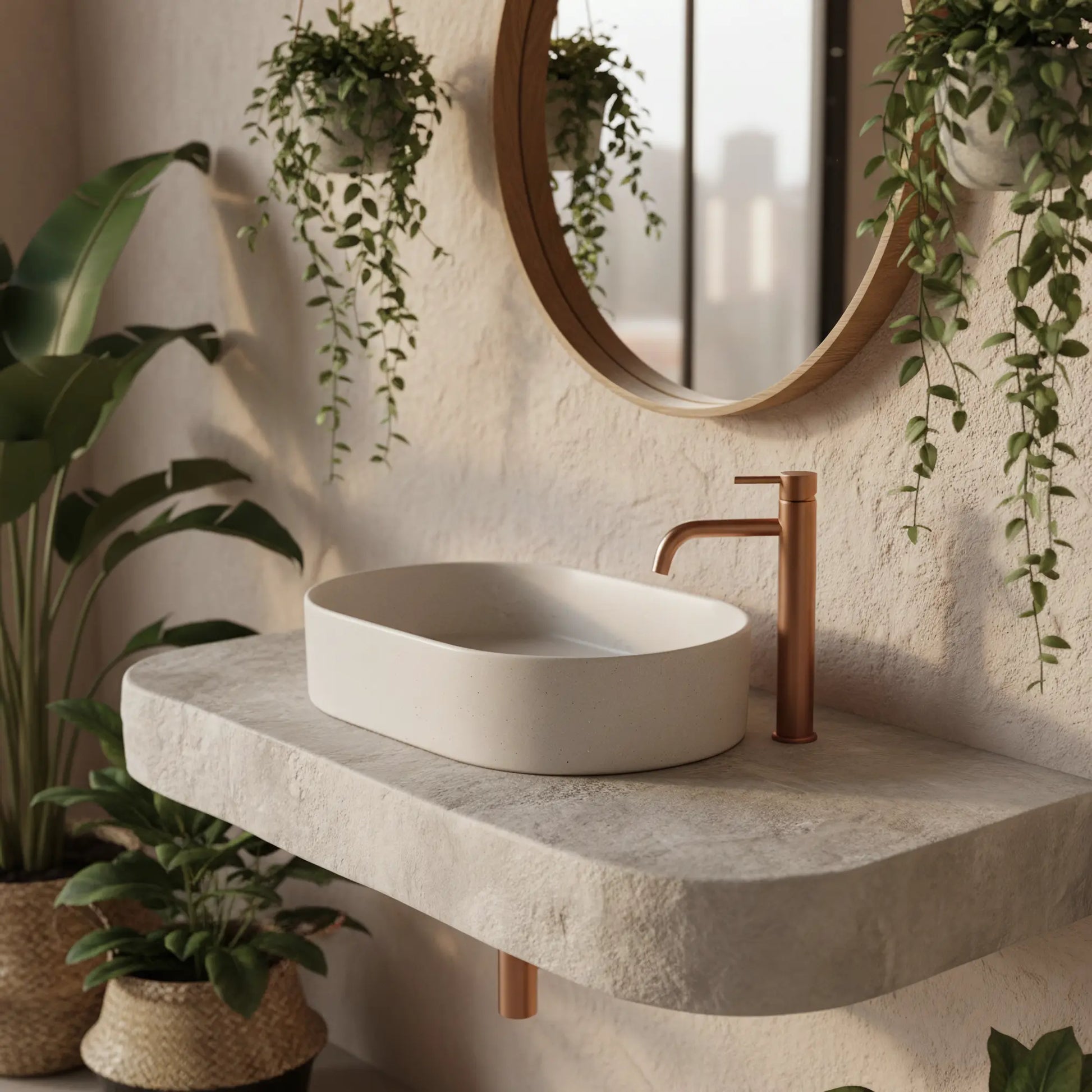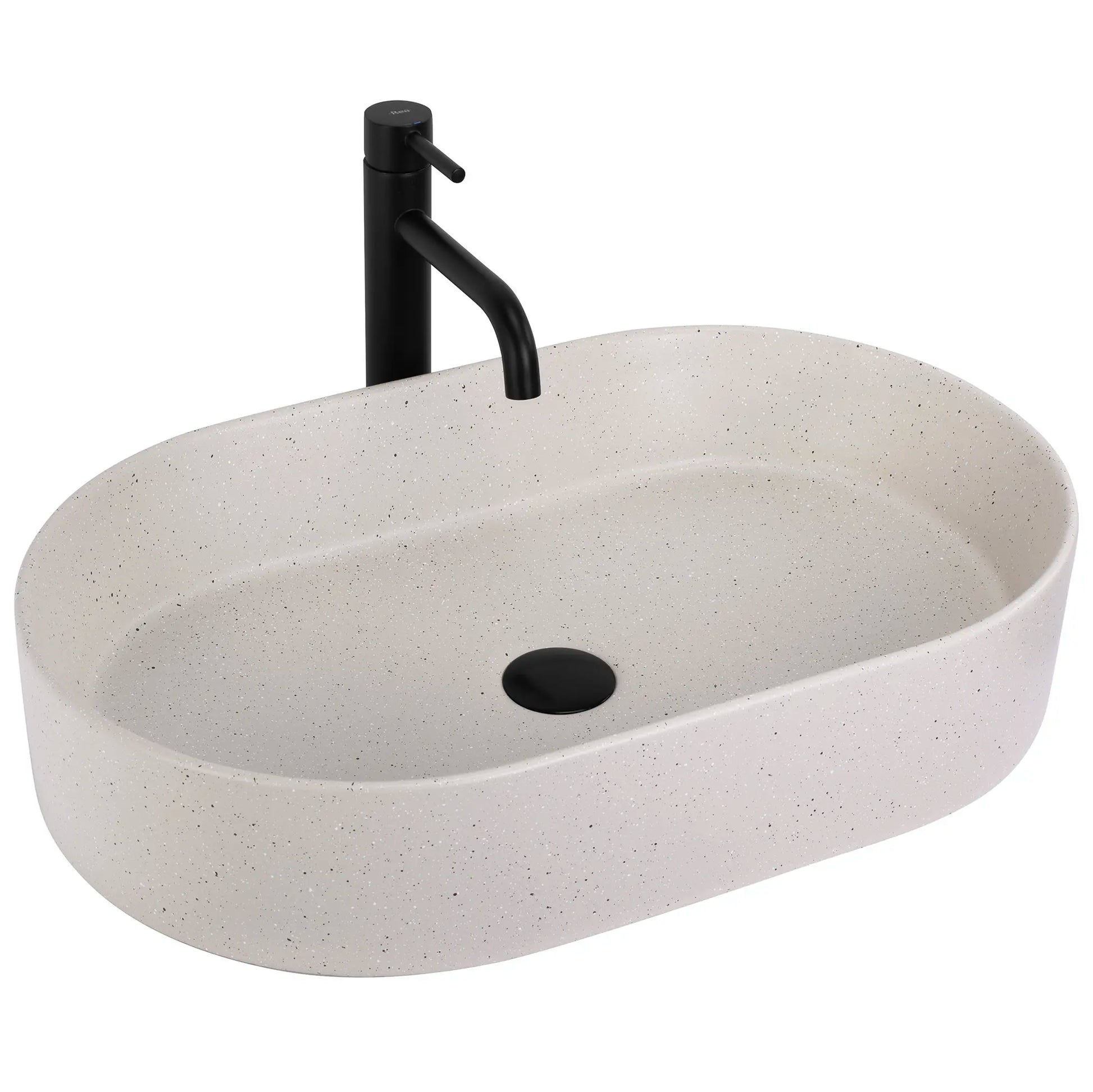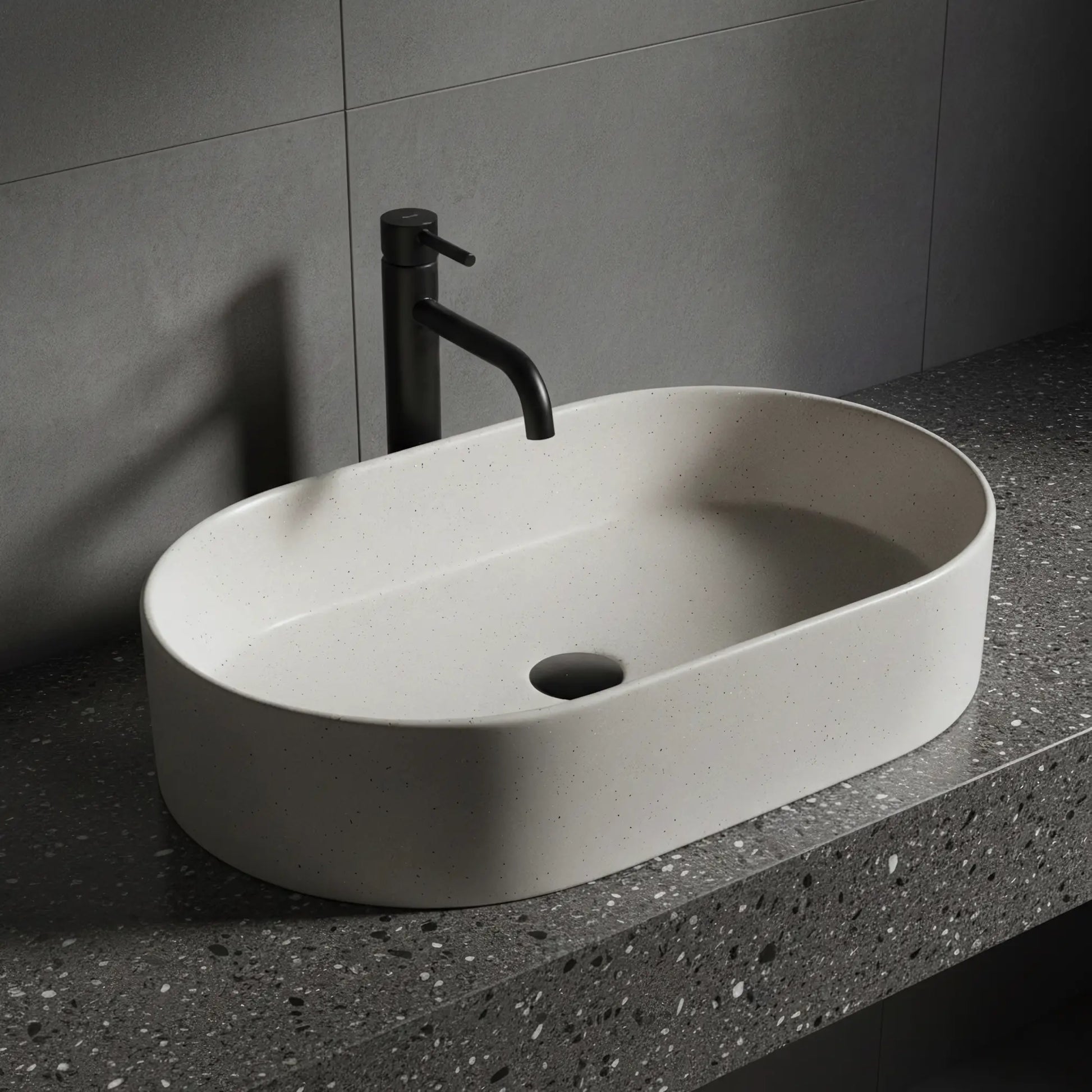Dieses ovale Aufsatzwaschbecken in sandfarbener Steinoptik vereint modernes Design mit einer natürlichen, hochwertigen Ausstrahlung. Die feine, leicht gesprenkelte Oberfläche sorgt für eine elegante Beton- bzw. Stone-Optik und macht jedes Waschbecken zu einem Unikat.