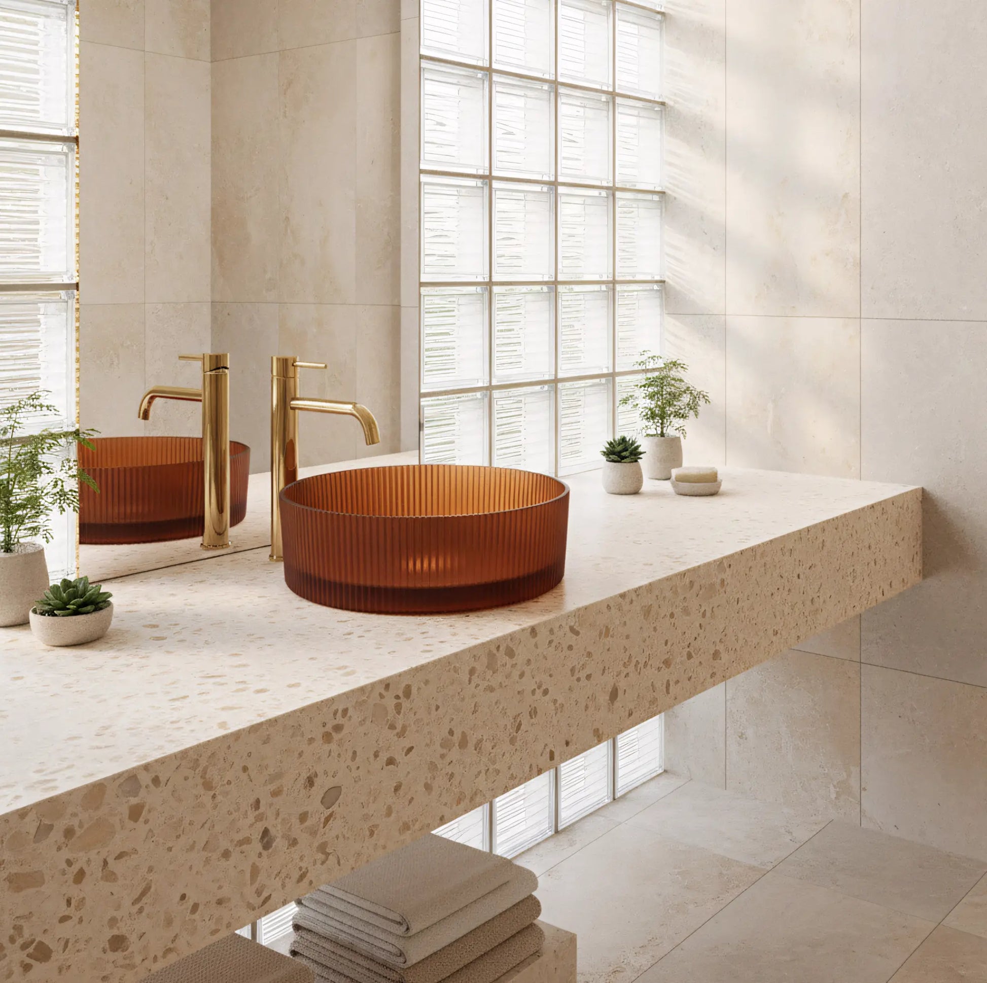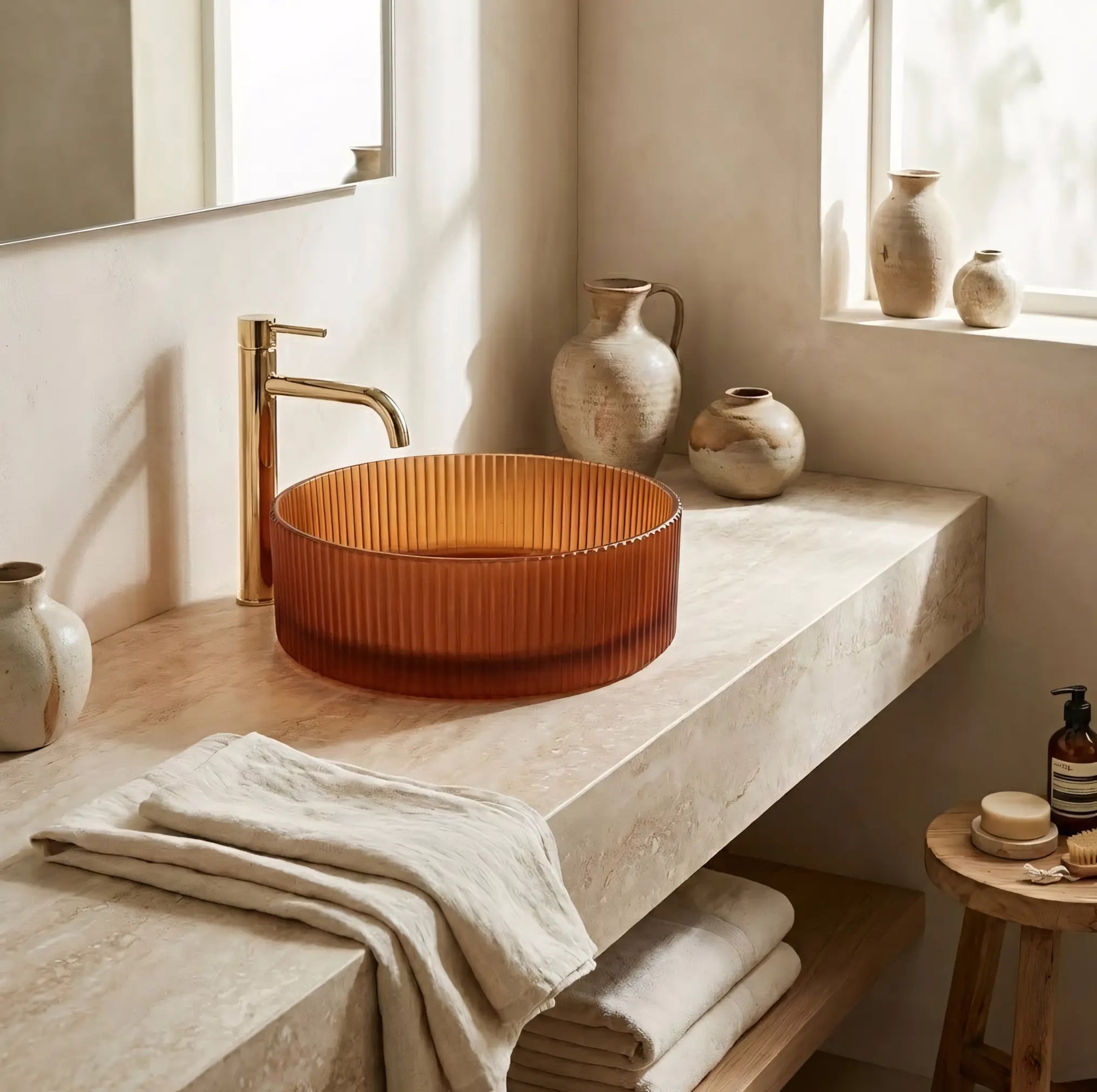 Dieses Aufsatzwaschbecken aus hochwertigem Einscheibensicherheitsglas in bernsteinfarbenem Braun besticht durch seine warme, bernsteinfarbene Farbe und die markante, strukturierte Außenfläche mit feinen vertikalen Linien. Das satinierte Glas verleiht dem Becken eine elegante Optik und unterstreicht den dekorativen Charakter des Waschplatzes.