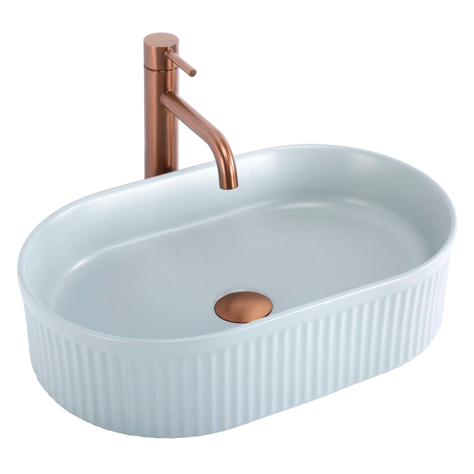 Das Aufsatzwaschbecken Vanda in elegantem Babyblau Matt bringt frische Leichtigkeit in dein Badezimmer. Mit seiner ovalen Form und der modernen, geriffelten Außenseite ist es ein echtes Design-Statement, das Funktionalität und Ästhetik perfekt vereint.