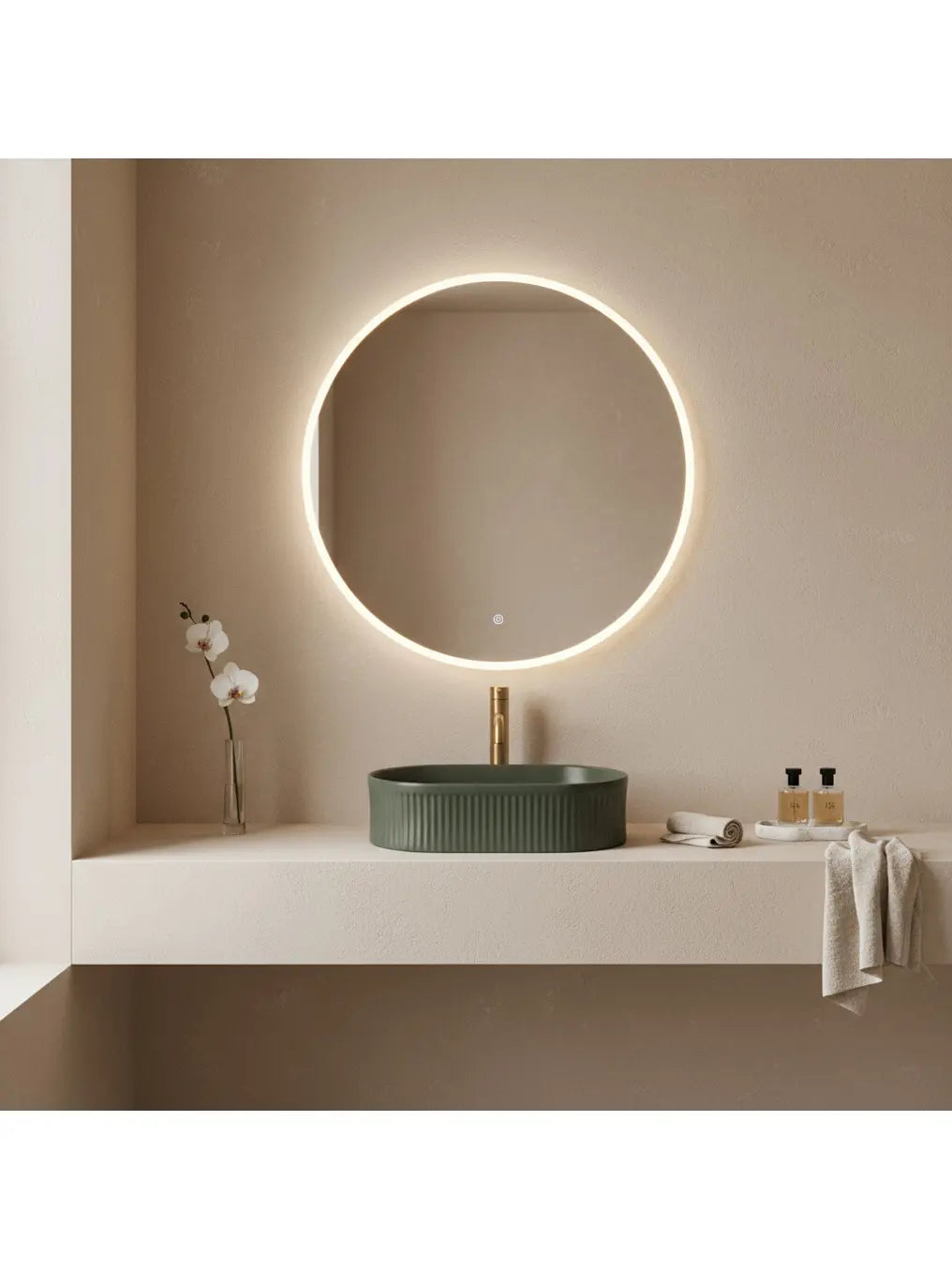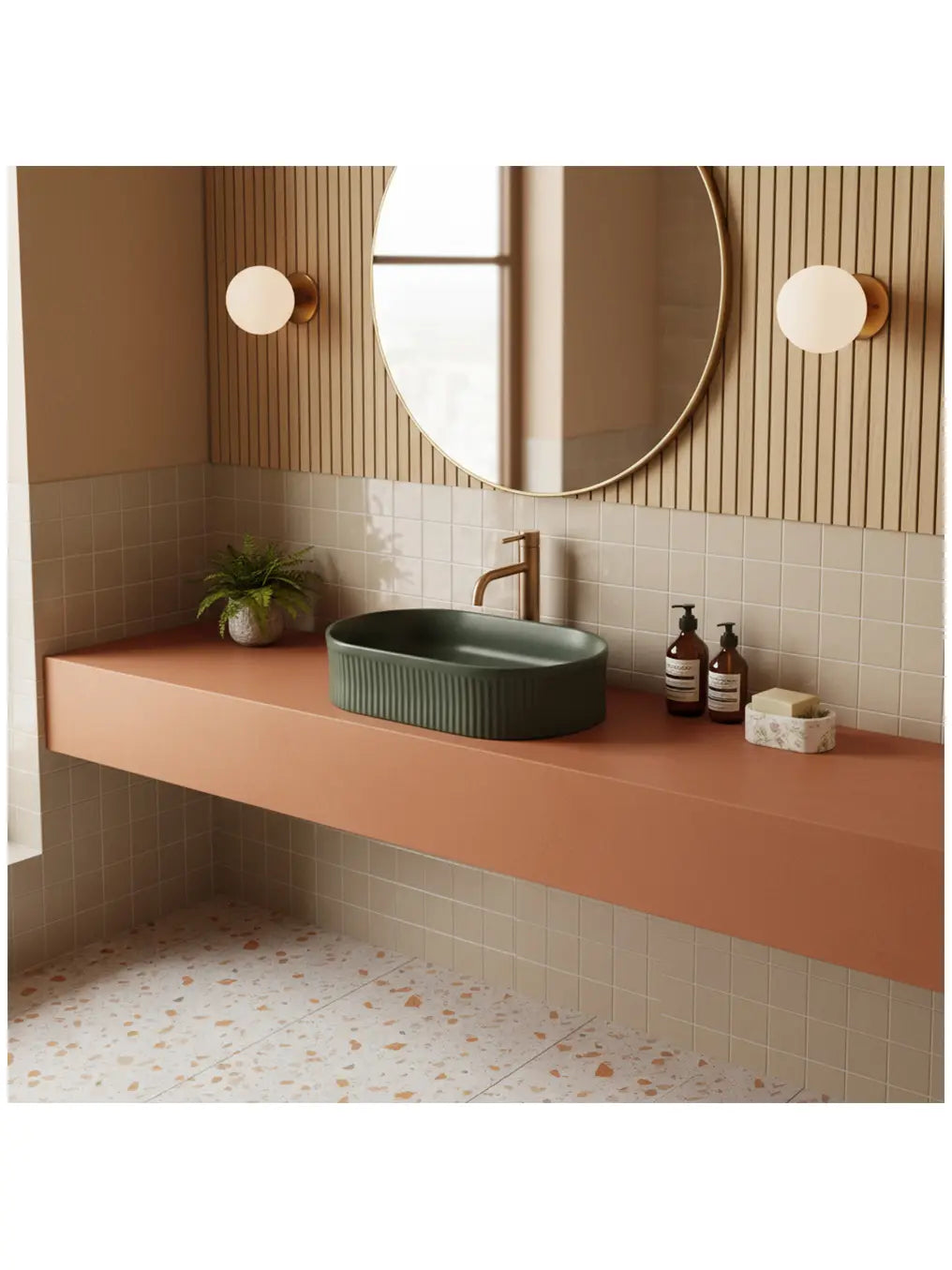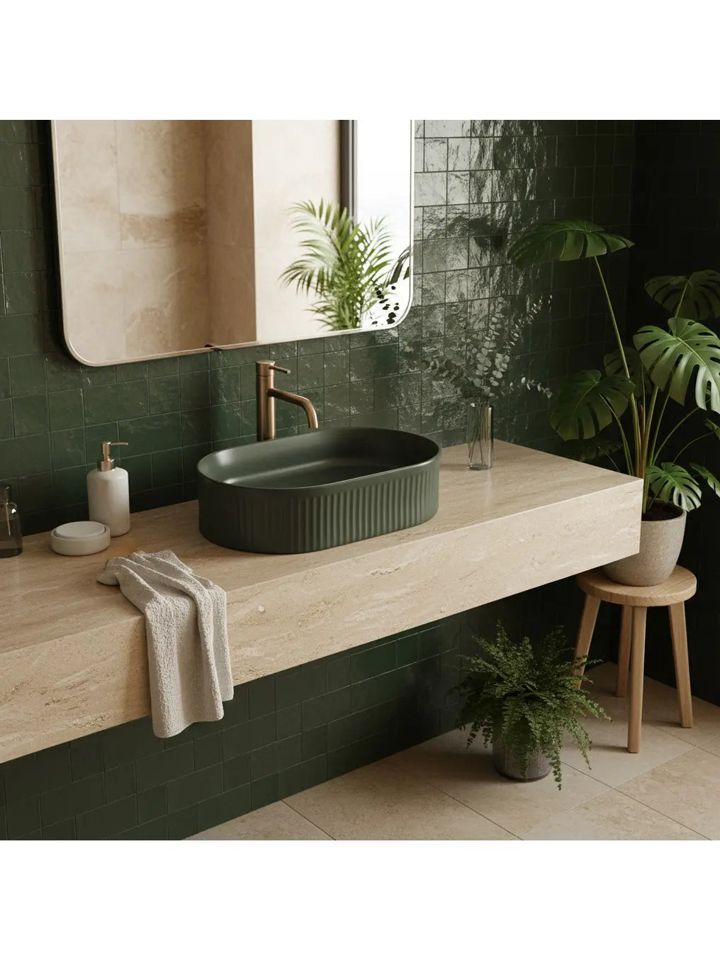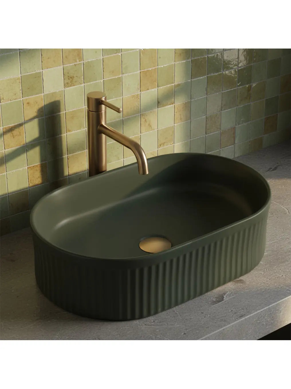 Mit seiner ovalen Form fügt sich „Vanda Olive“ harmonisch in verschiedene Badstile ein – von modern-minimalistisch bis hin zu elegant-natürlich.
