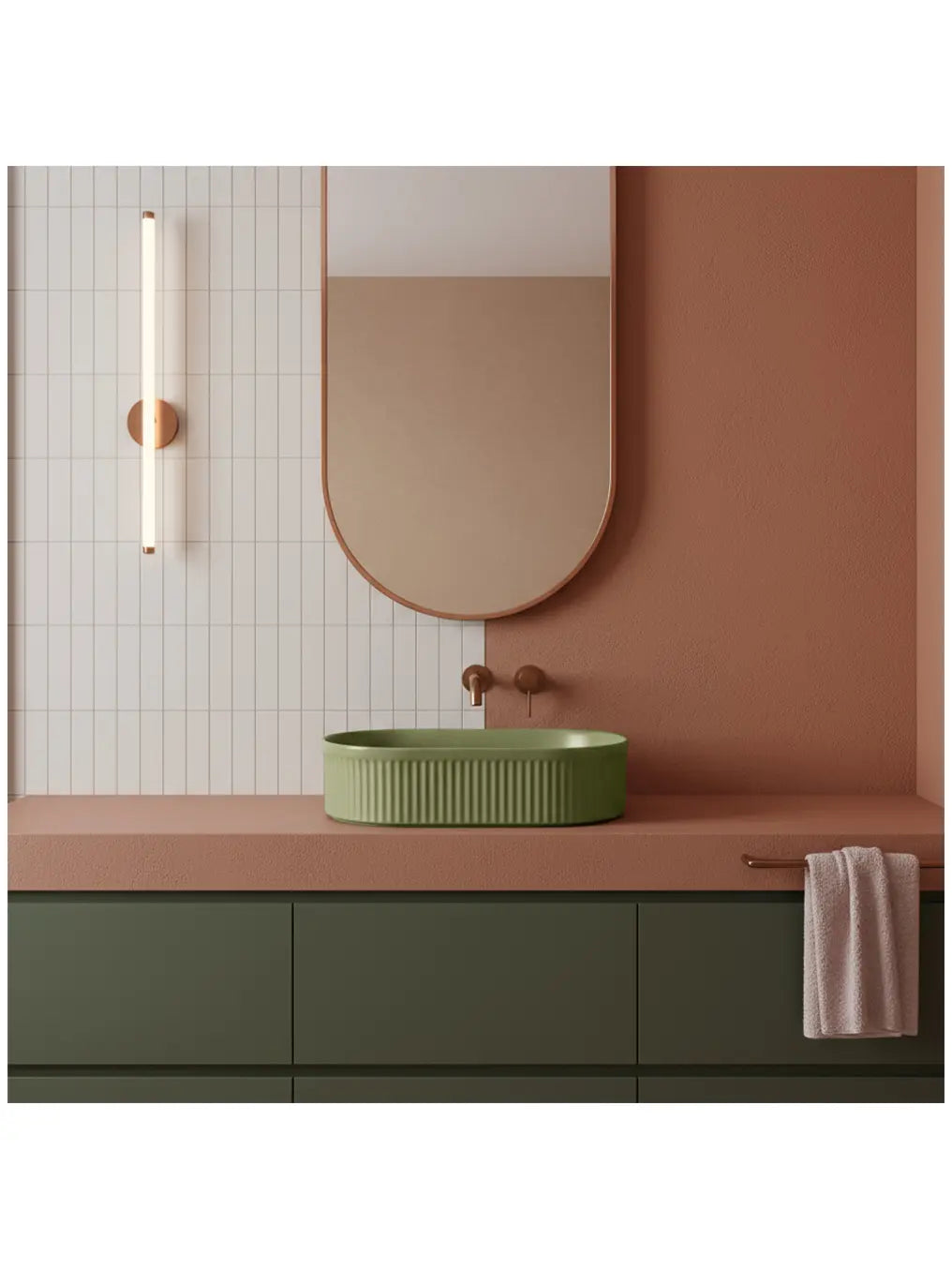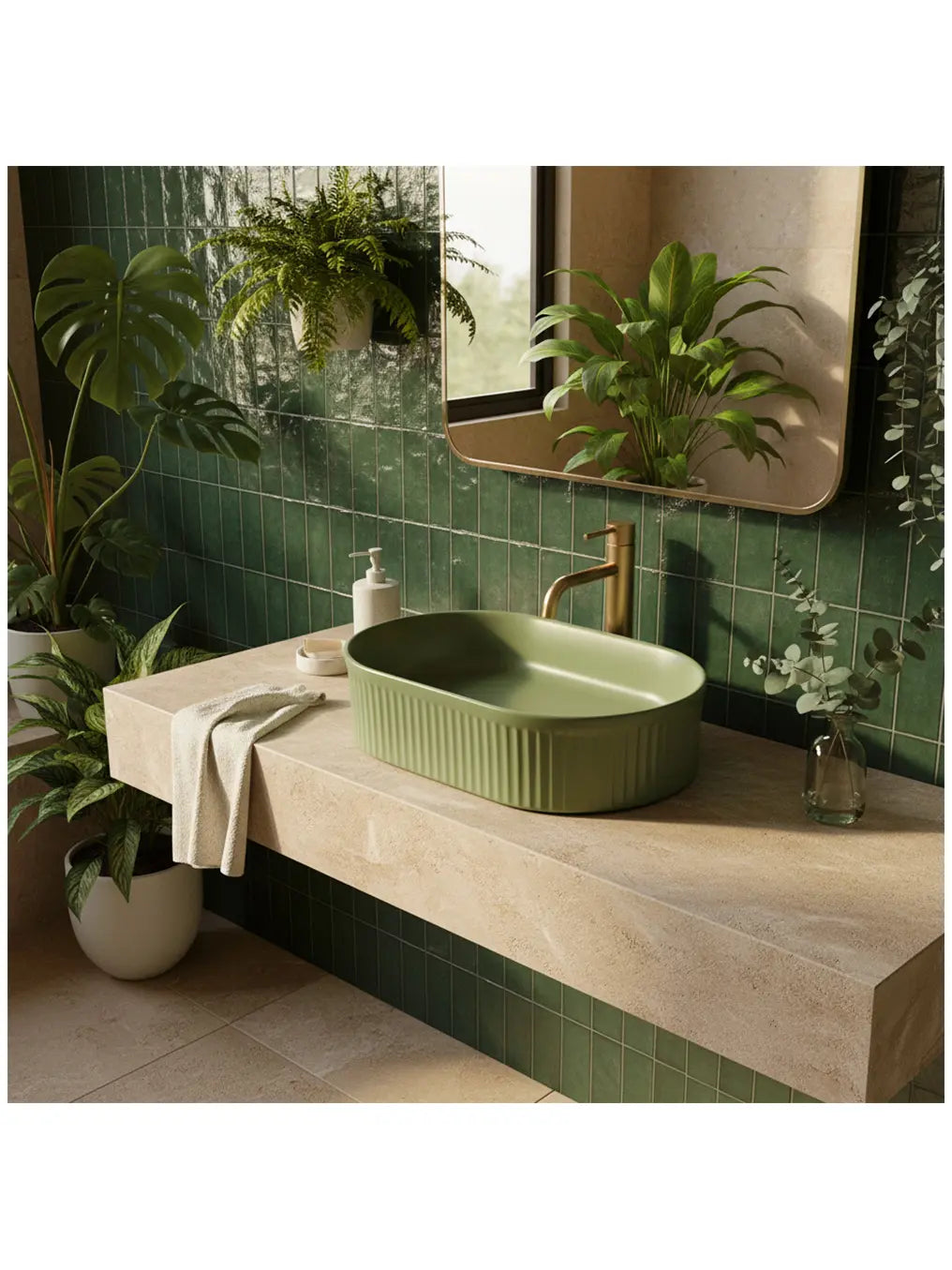 Das Aufsatzwaschbecken „Vanda Pistachio“ bringt frische Eleganz und Stil in Ihr Badezimmer. Die sanfte Farbe Pistaziengrün kombiniert mit der feinen Rillenstruktur verleiht dem Becken eine moderne, aber zugleich warme Ausstrahlung.