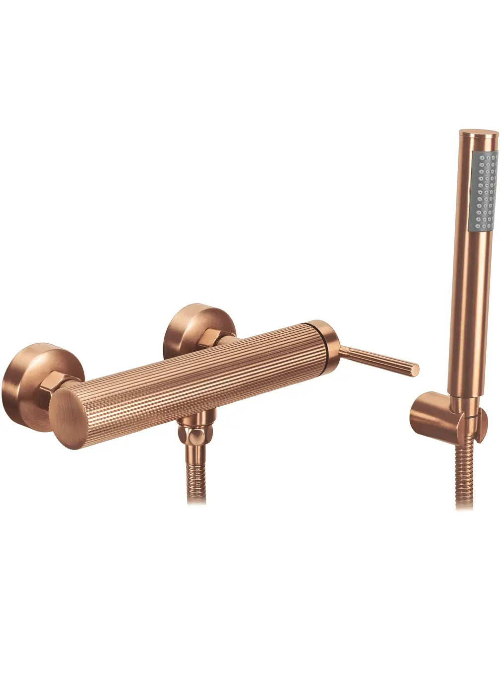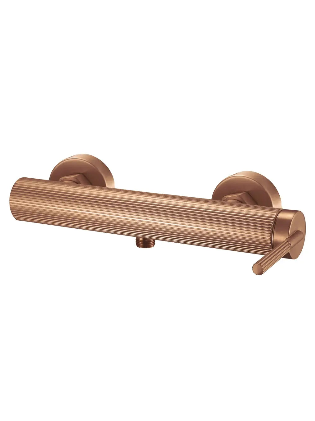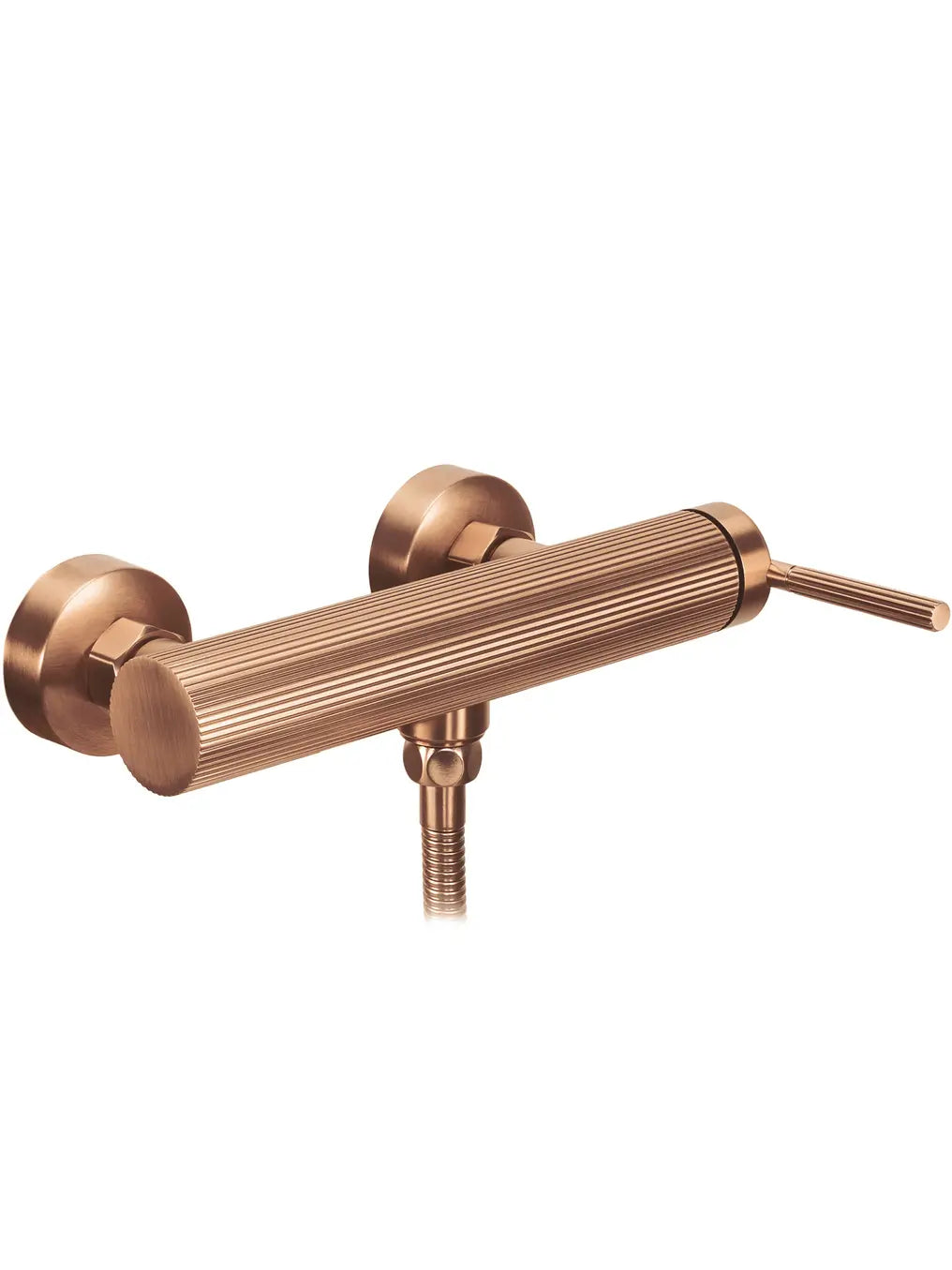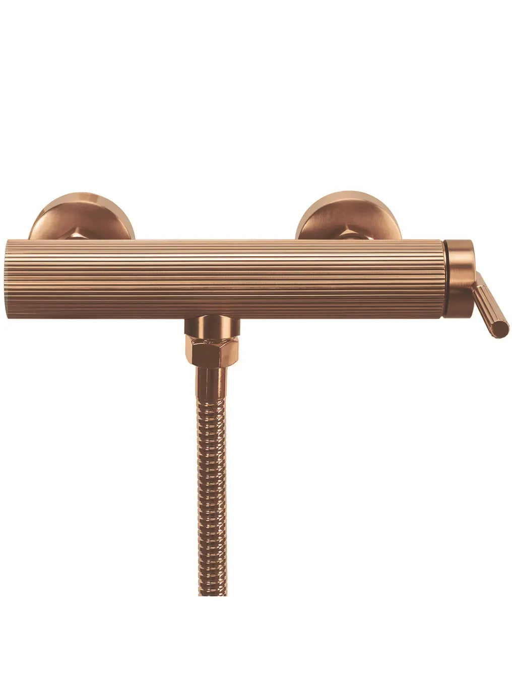 Die Duscharmatur Argon in Kupfer Matt überzeugt mit einem eleganten, modernen Design und erstklassiger Verarbeitung. Der fein gerillte Korpus verleiht ihr eine besondere Tiefe und sorgt für eine angenehme Haptik. Der schmale Einhebelgriff ermöglicht eine präzise Steuerung von Wasserfluss und Temperatur. Die schlanke Handbrause aus massivem Messing ergänzt das Set ideal und rundet den hochwertigen Gesamteindruck ab.
