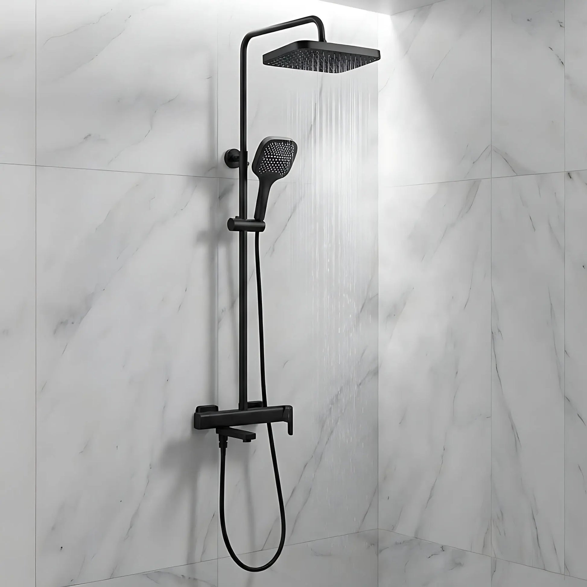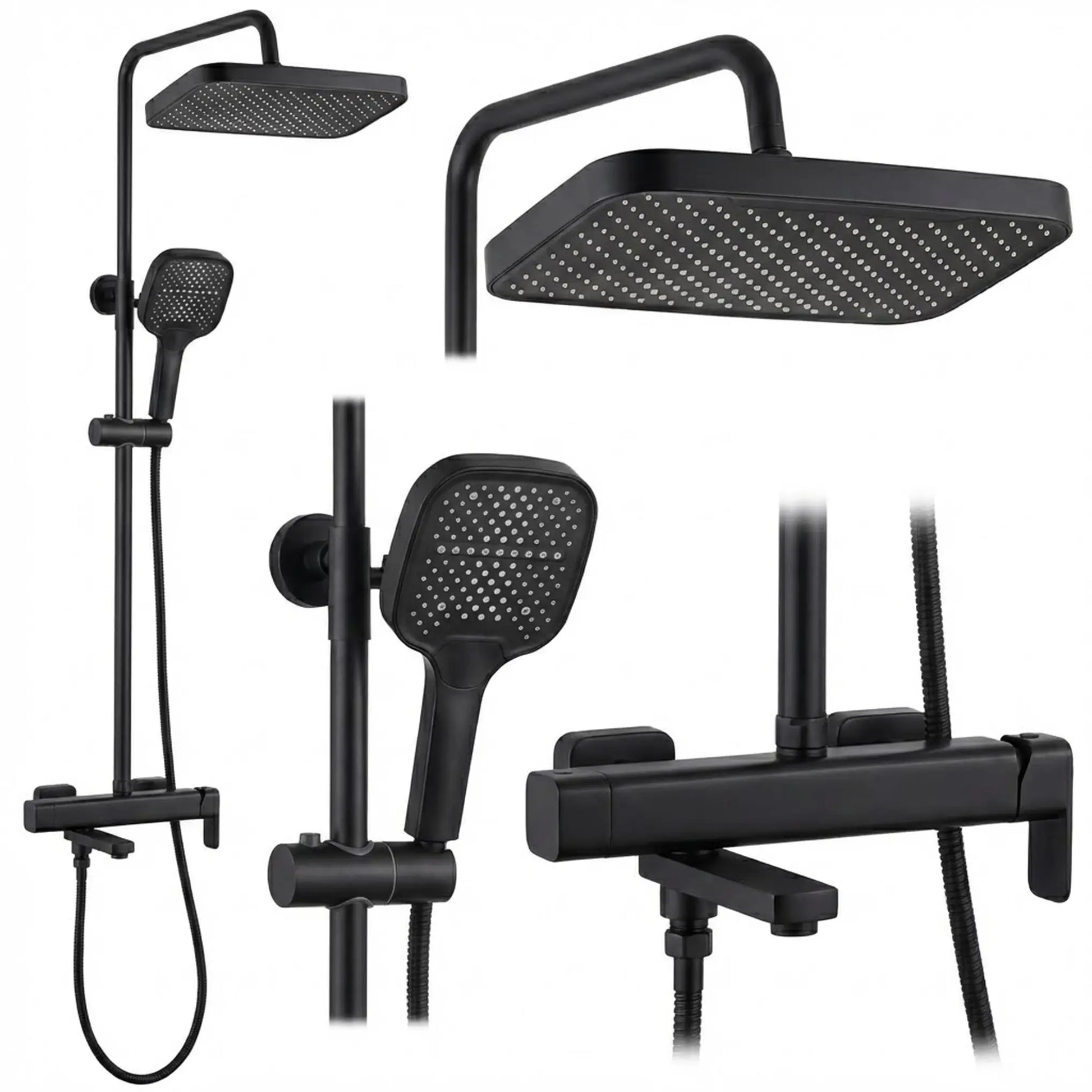 Das Aufputz-Duschset in Mattschwarz bringt moderne Akzente in Ihr Badezimmer und passt perfekt zu Loft- und zeitgemäßen Einrichtungen. Kopf- und Handbrause mit klaren, quadratischen Formen harmonieren mit der matten Oberfläche und schaffen ein stilvolles, minimalistisches Gesamtbild. Das Set kombiniert optische Eleganz mit praktischen Details für die tägliche Nutzung.