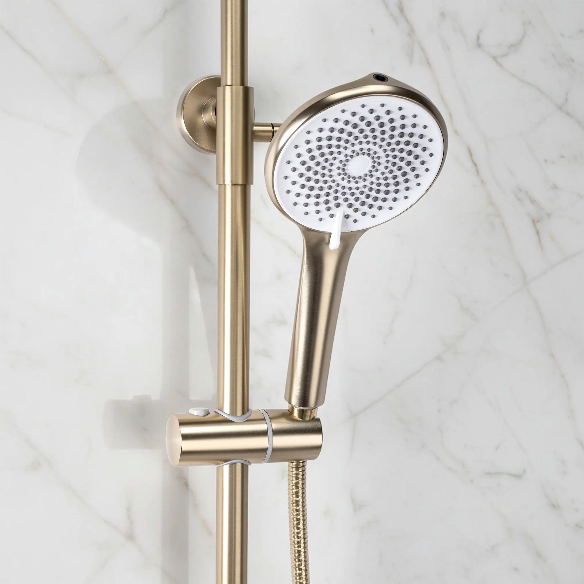Dieses hochwertige Duschsystem in Gold matt verbindet modernes Design mit hohem Duschkomfort. Die elegante, gebürstete Oberfläche sorgt für eine edle Optik und fügt sich perfekt in stilvolle Badezimmer und moderne Badkonzepte ein.
