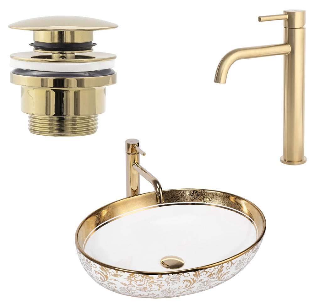 Aufsatzwaschbecken-Set „Margot White Gold“ – Ovales Dekorbecken Weiß/Gold mit hoher Einhebelarmatur & Push-Open Ablauf in Gold poliert