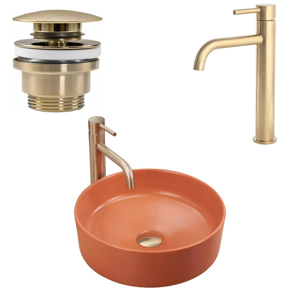 Warm, modern, außergewöhnlich: Das runde Keramik-Aufsatzwaschbecken in Terrakotta-Matt wird durch eine schlanke Einhebel-Waschtischarmatur in Gold-Matt (gebürstetes Messing) und ein passendes Click-Clack-Ablaufventil zum stimmigen Blickfang in Bad und Gäste-WC. Ideal für mediterrane, Boho- und moderne Natur-Looks.