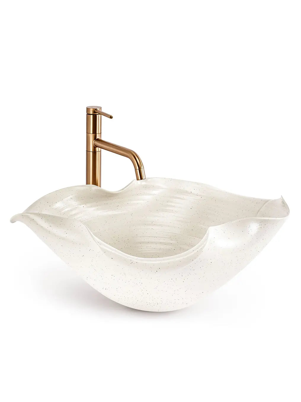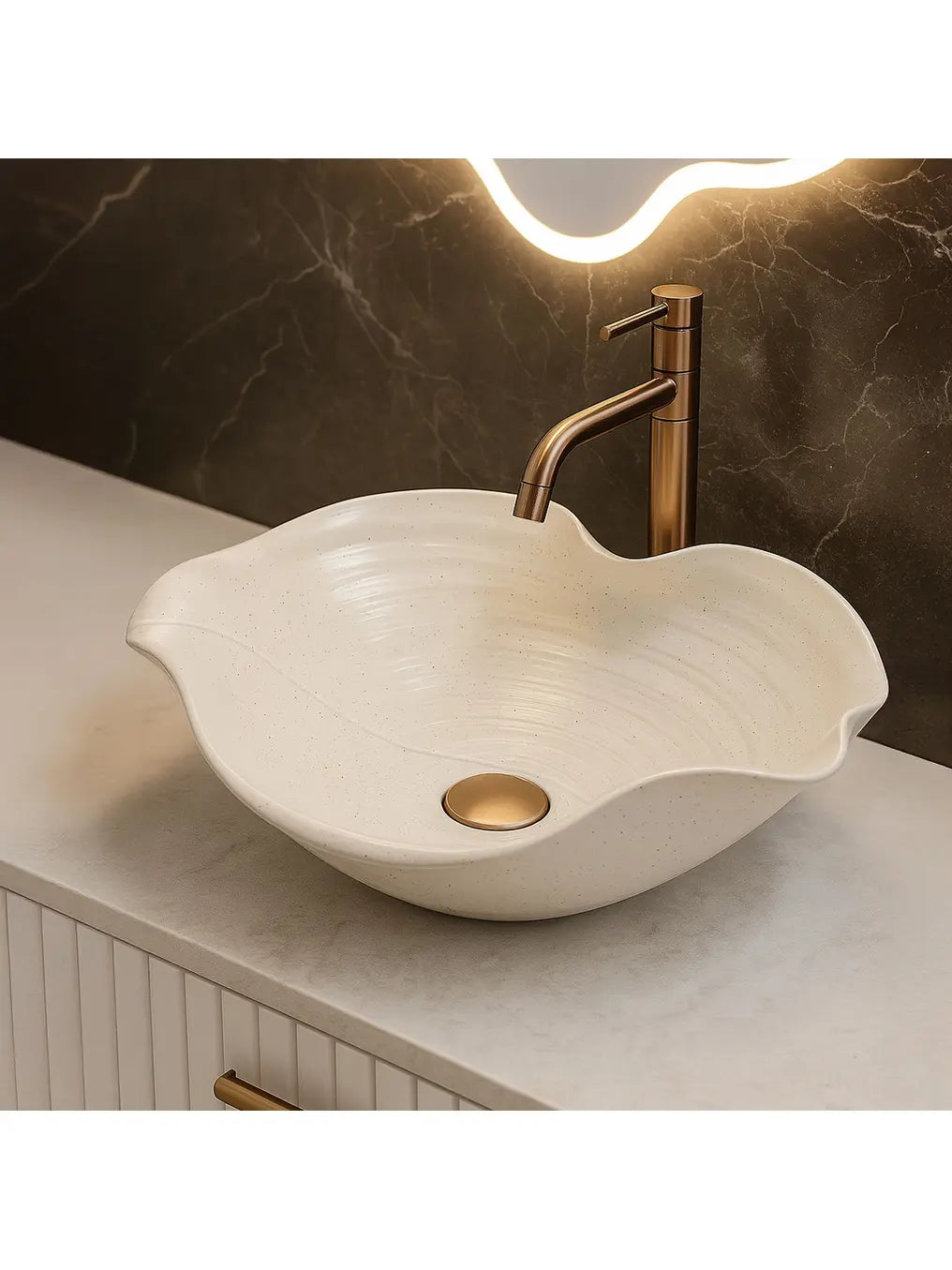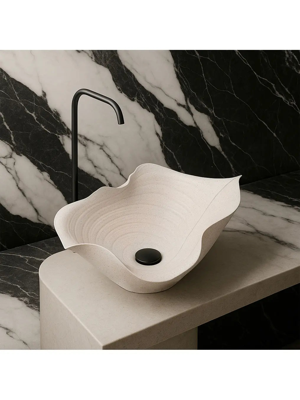 Dieses außergewöhnliche Aufsatzwaschbecken überzeugt durch seine naturinspirierte, wellenartige Form und wird sofort zum Blickfang in jedem Badezimmer. Die sanft geschwungenen Linien schaffen einen harmonischen, fließenden Look, der sowohl moderne als auch klassische Badkonzepte stilvoll ergänzt.