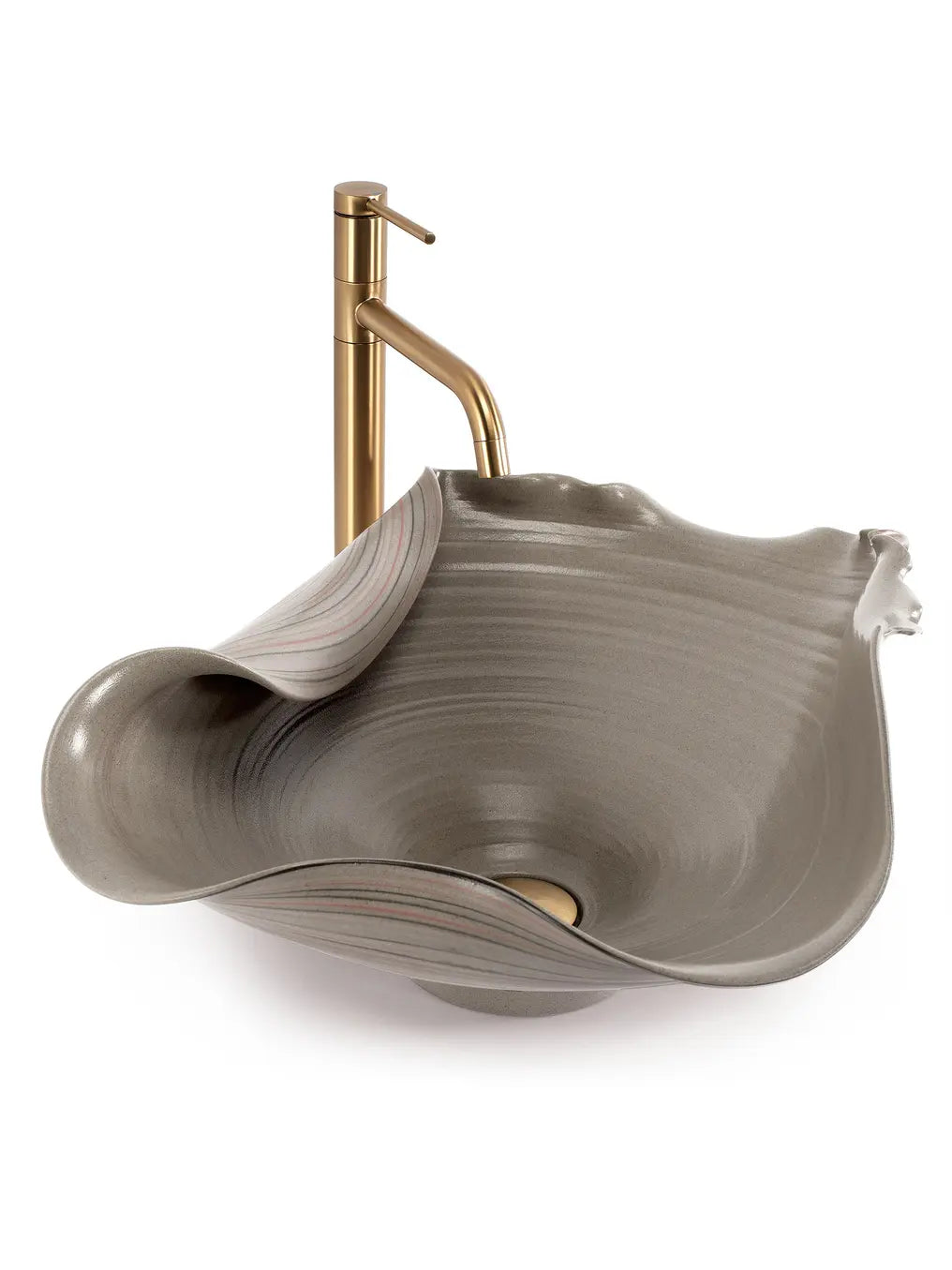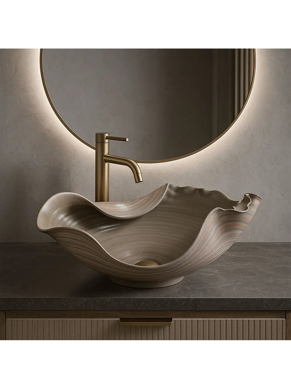 Dieses außergewöhnliche Aufsatzwaschbecken verbindet kreative Formgebung mit hochwertiger Handwerkskunst und verleiht jedem Badezimmer einen exklusiven Designer-Look. Die organische, fließende Silhouette erinnert an natürliche Wellenstrukturen und setzt stilvolle Akzente in modernen wie auch individuellen Badkonzepten.