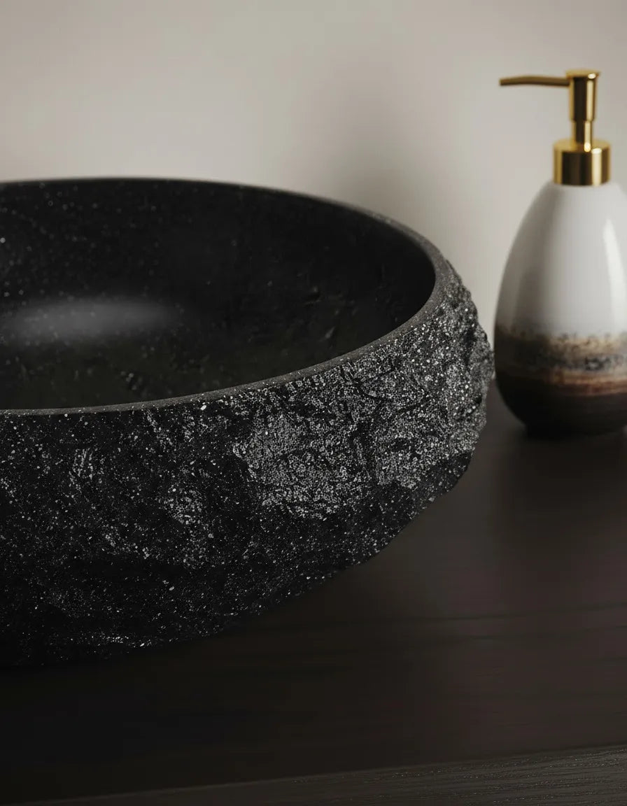 Natürlich, pur, individuell: Mika Black ist ein rundes Aufsatzwaschbecken in Steinoptik mit rauer Außenstruktur und sanft polierter Innenfläche. Der behutsame Farbmix aus Schwarz - und Anthrazittönen macht es zum Blickfang für Bad & Gäste-WC – ideal zu Holz, Beton und warmen Metalloberflächen.