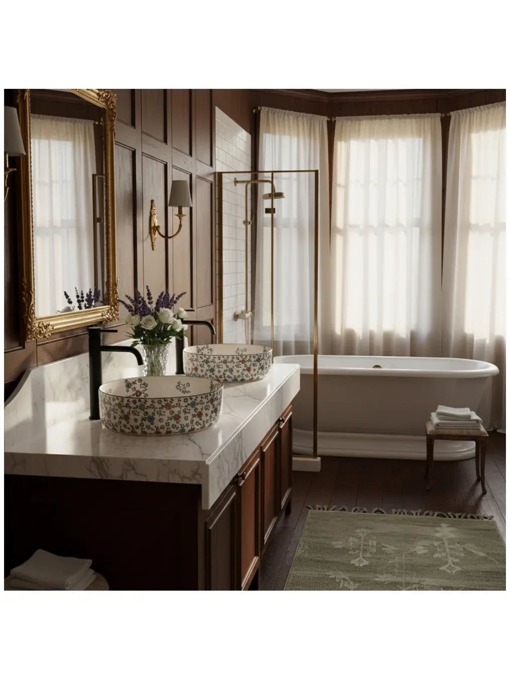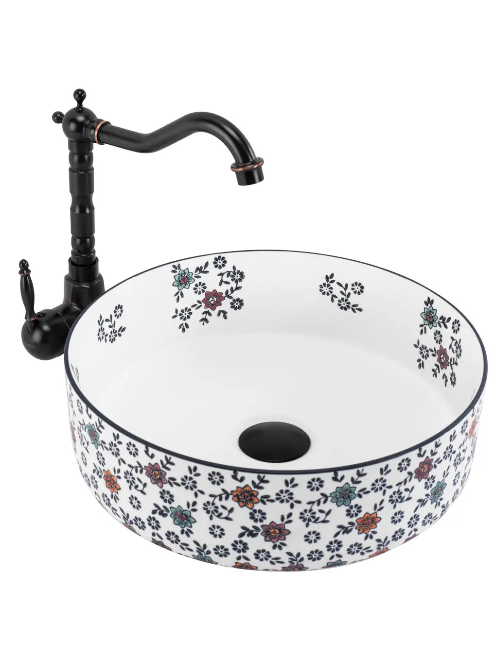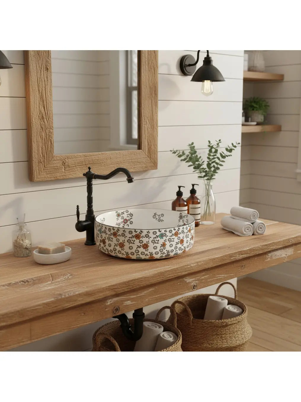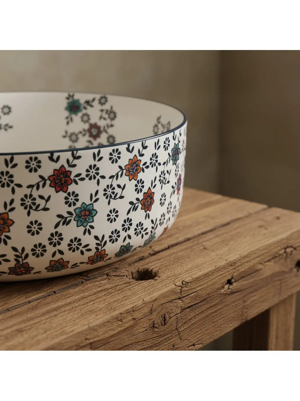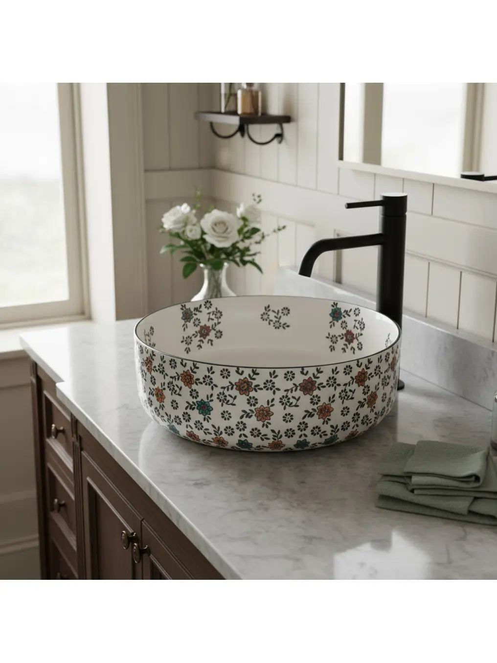 Verleihen Sie Ihrem Bad einen Hauch von mediterranem Flair mit dem Waschbecken „Stefania“. Dieses runde Aufsatzwaschbecken aus hochwertiger Keramik besticht durch sein kunstvolles Blumenmuster in harmonischen Farben und wird so zum stilvollen Highlight auf jeder Waschtischplatte.